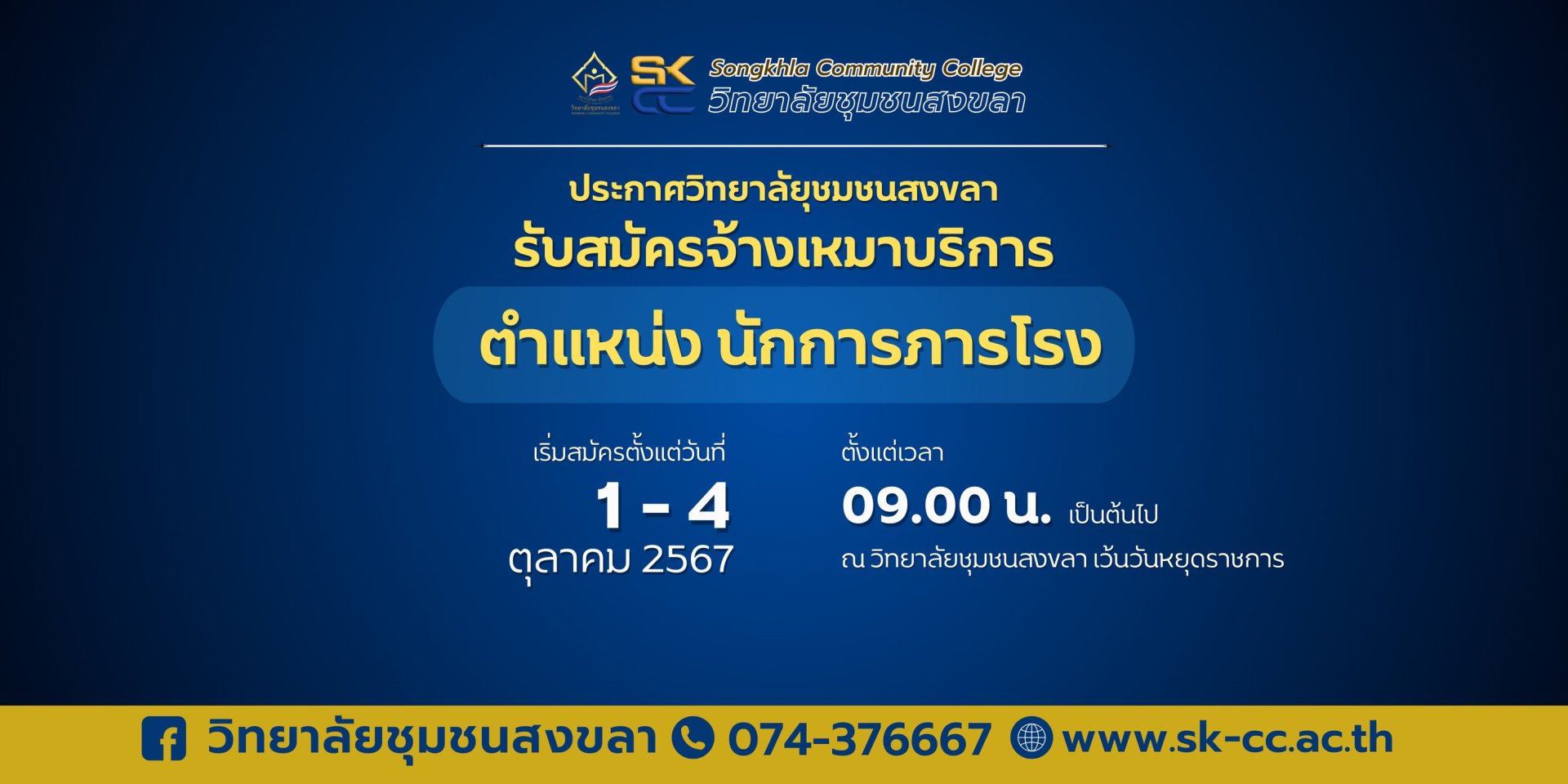 รับสมัครตั้งแต่วันที่ 1-4 ตุลาคม 2567 เวลา 09.00 น. เป็นต้นไป ณ วิทยาลัยชุมชนสงขลา