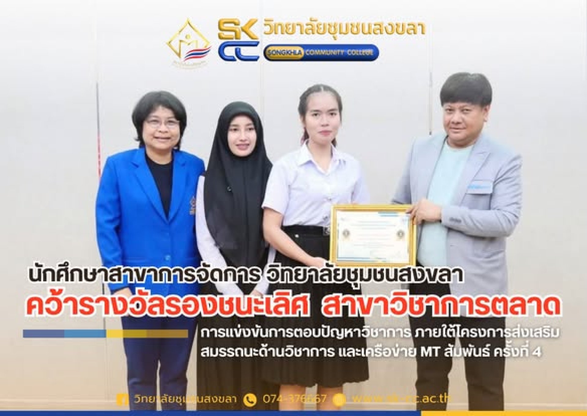 วิทยาลัยชุมชนสงขลา ส่งนักศึกษาสาขาการจัดการ 3 ชั้นปี จำนวน 4 ทีม เข้าร่วมแข่งขันสร้างเสริมประสบการณ์ด้านธุรกิจ กับคณะเศรษฐศาสตร์และบริหารธุรกิจ มหาวิทยาลัยทักษิณ จังหวัดสงขลา ภายใต้ "โครงการส่งเสริมสมรรถนะด้านการประกอบการและเครือข่าย MT ครั้งที่4" ภายใต้กลุ่มแข่งขันด้านการตลาด รับรางวัลรองชนะเลิศ สาขาวิชาการตลาด