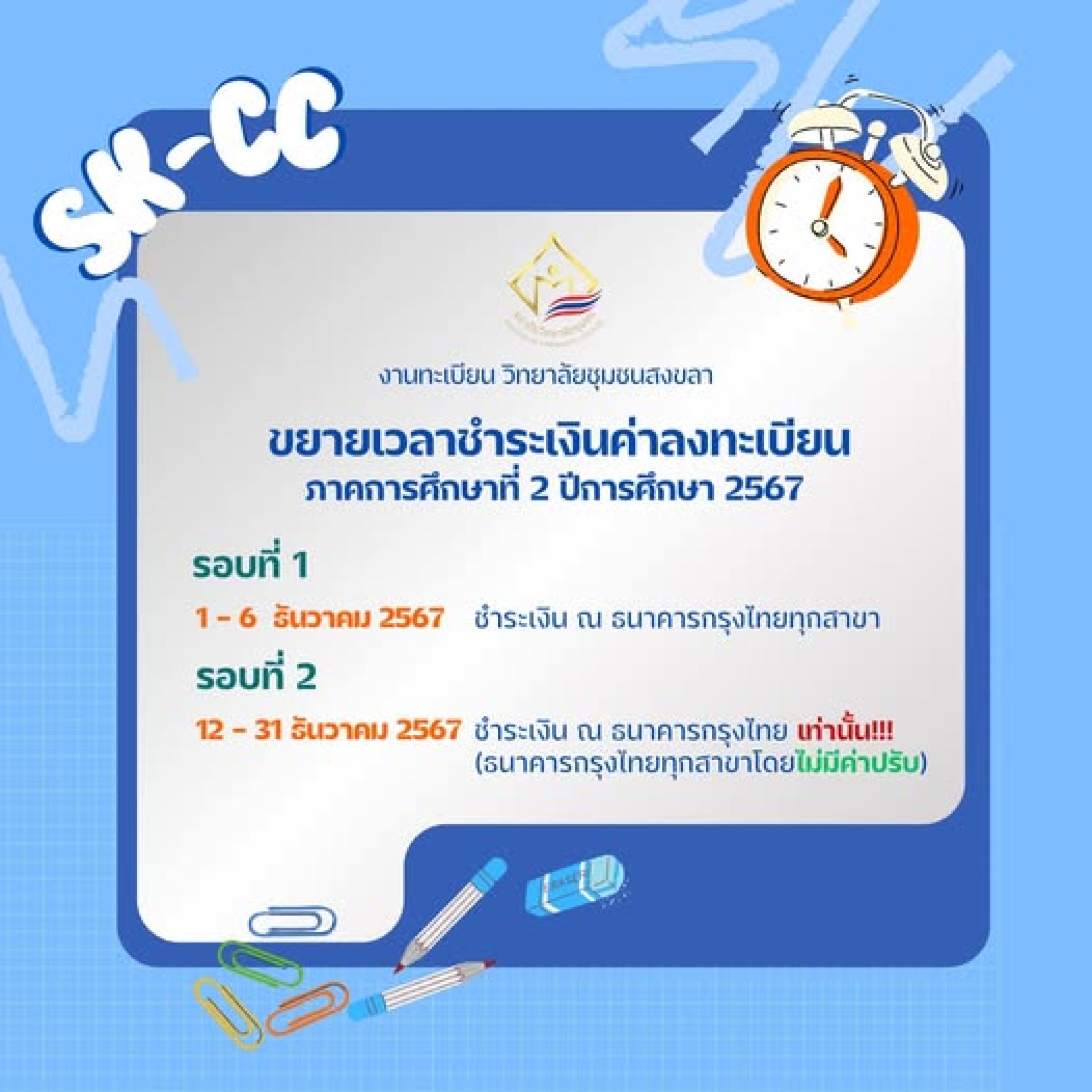 เนื่องด้วยสถานการณ์อุทกภัยในพื้นที่จังหวัดสงขลาเพื่อเป็นการบรรเทาความเดือดร้อนของนักศึกษา วิทยาลัยชุมชนสงขลามีมาตรการขยายเวลาชำระเงินค่าลงทะเบียน ภาคการศึกษาที่ 2 ปีการศึกษา 2567