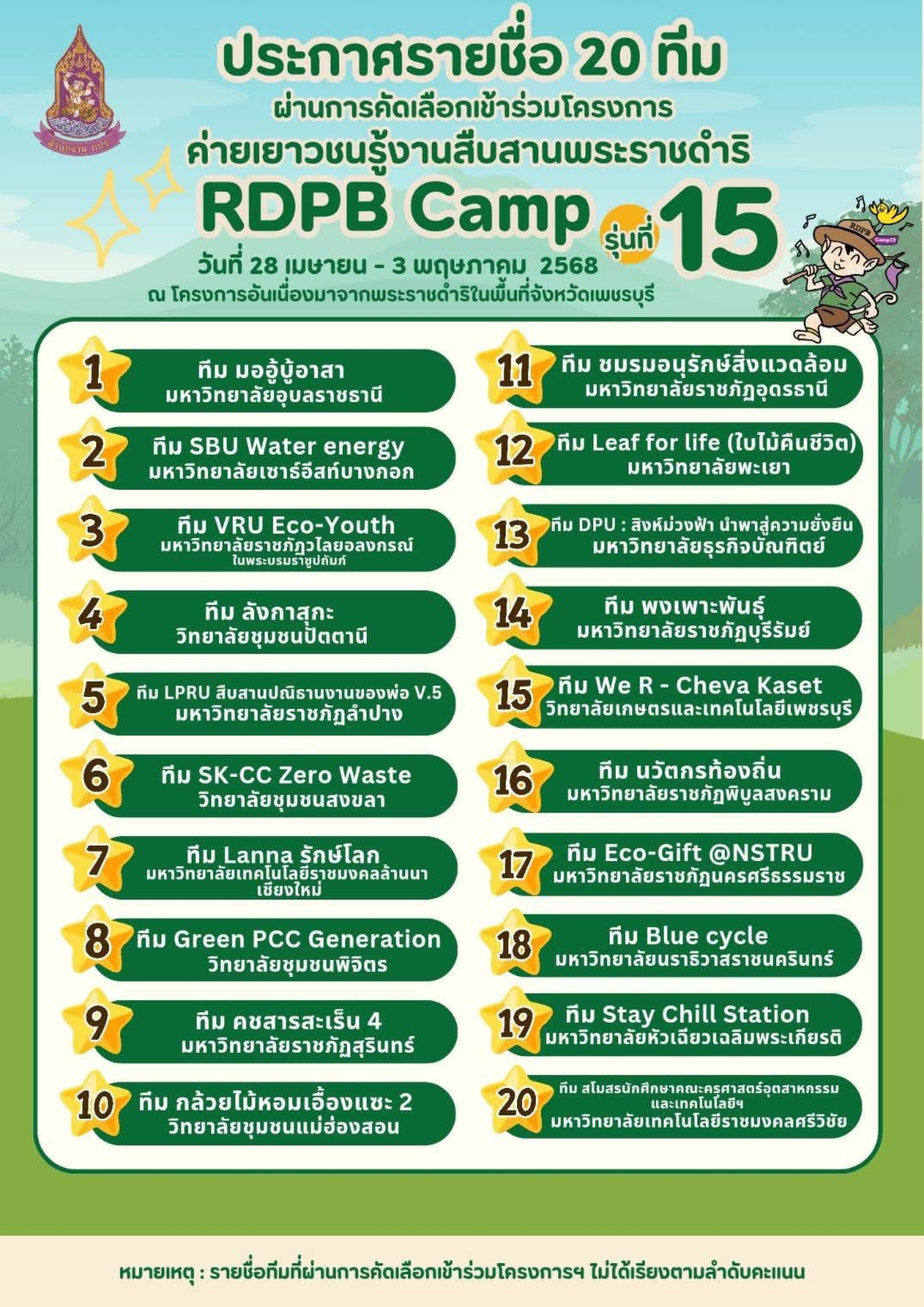 ผ่านการคัดเลือกเข้ารอบ 20 ทีมสุดท้าย เข้าร่วมโครงการ ค่ายเยาวชนรู้งานสืบสานพระราชดำริ (RDPB Camp) รุ่นที่ 15 ประจำปี 2568 (RDPB Camp) ของสำนักงานคณะกรรมการพิเศษ เพื่อประสานงานโครงการอันเนื่องมาจากพระราชดำริ (สำนักงาน กปร.) ภายใต้หัวข้อ Eco - Youth สืบสานงานพัฒนา สร้างสรรค์นวัตกรรม พัฒนาสู่ความยั่งยืน