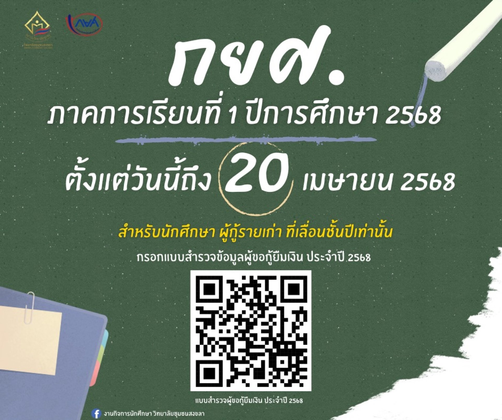 *** เนื่องด้วยทางกองทุนกู้ยืมเพื่อการศึกษาได้กำหนดมาตรการพิจารณาและคัดเลือกการให้กู้ยืม ประจำปี 2568 ทำให้ต้องมีการสำรวจข้อมูลผู้กู้ยืมเงินกองทุนเพื่อการศึกษา กยศ. ผู้กู้รายเก่าที่เลื่อนชั้นปี ประจำปี 2568 ให้นักศึกษาดำเนินการกอรอกข้อมูลเบิ้องต้นเพื่อประกอบการพิจารณาในการกู้ยืมในปี 2568 ต่อไป