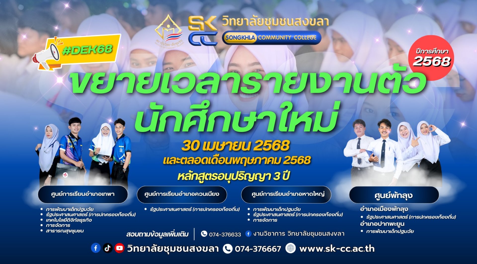 งานวิชาการ วิทยาลัยชุมชนสงขลา ขยายเวลารายงานตัวนักศึกษาใหม่ หลักสูตรอนุปริญญา ปีการศึกษา 2568