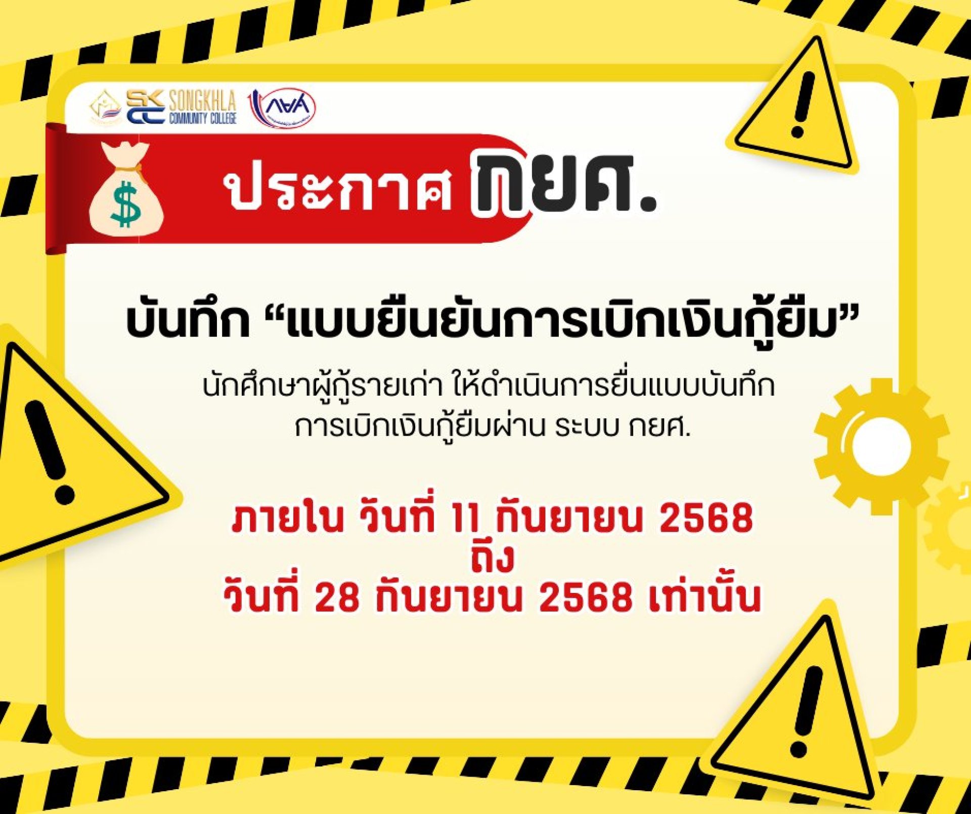 แจ้งนักศึกษา ผู้กู้ยืมเงินกองทุนให้กู้ยืมเพื่อการศึกษา กยศ. รายเก่า รหัส 66และ67 ประจำปีการศึกษา 2568 ให้ดำเนินการบันทึก แบบยืนยันการเบิกเงินกู้ยืม ของ #ภาคการศึกษาที่2 ผ่านระบบ ของ กยศ. ภายในวัยที่ 11 กันยายน 2568 ถึง วันที่ 28 กันยายน 2568