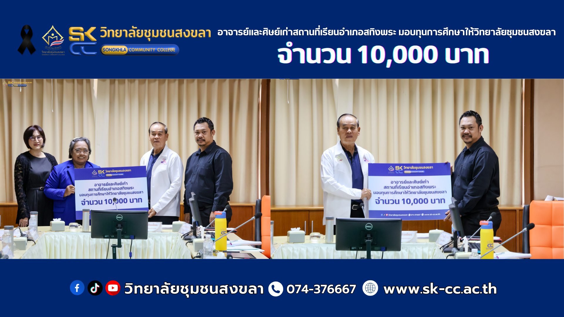 อาจารย์สุธี เทพสุริวงค์ ผู้ช่วยผู้อำนวยการฯและตัวแทนอาจารย์และศิษย์เก่าสถานที่เรียนอำเภอสทิงพระ มอบทุนการศึกษาให้วิทยาลัยชุมชนสงขลา จำนวน 10,000 บาท รับมอบโดย นายประเสริฐ แก้วเพ็ชร ประธานสภาวิทยาลัยชุมชนสงขลา และคณะกรรมการสภาวิทยาลัยชุมชนสงขลา มอบต่อให้กับวิทยาลัยชุมชนสงขลา โดยมี นายพิพัมน์พงษ์ หงษ์สัมฤทธิ์ ครูชำนาญการ รักษาราชการแทนผู้อำนวยการวิทยาลัยชุมชนสงขลา และนางสาวศุภมาส อยู่อริยะ รองผู้อำนวยการฯ รับมอบทุนการศึกษาในครั้งนี้