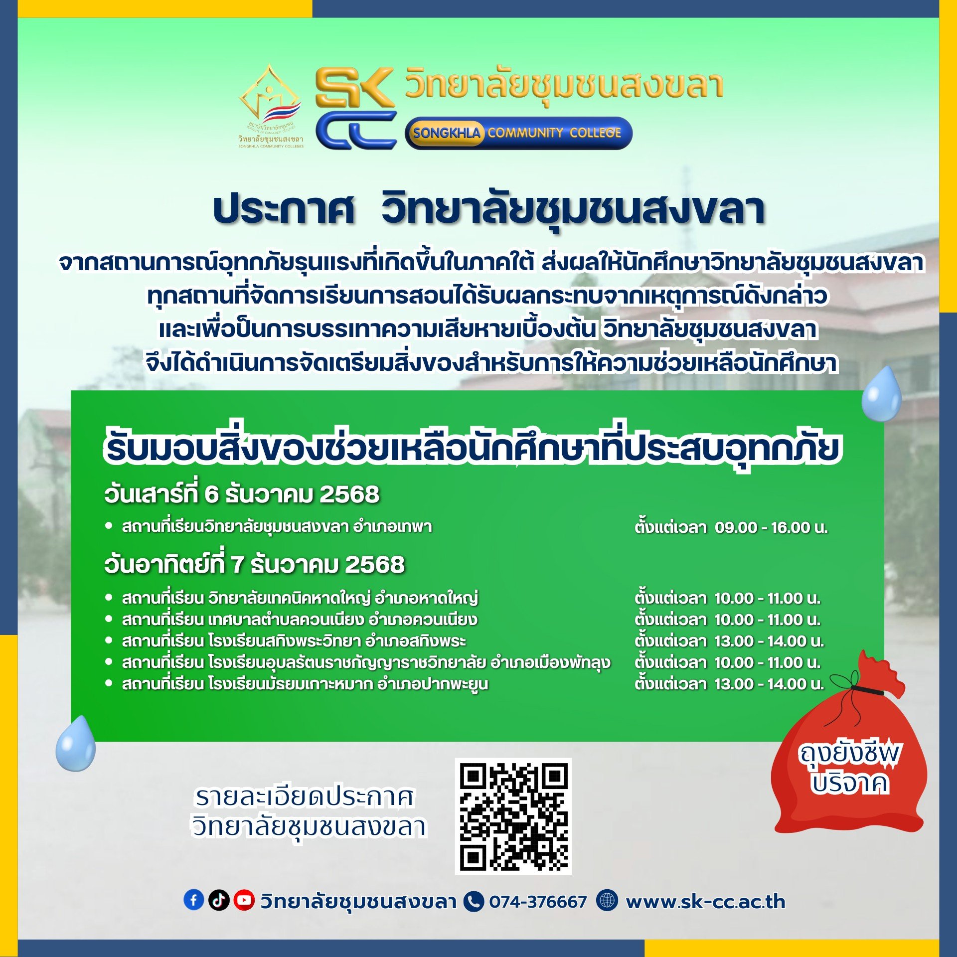 จากสถานการณ์อุทกภัยรุนแรงที่เกิดขึ้นในภาคใต้ ส่งผลให้นักศึกษาวิทยาลัยชุมชนสงขลา ทุกสถานที่จัดการเรียนการสอนได้รับผลกระทบจากเหตุการณ์ดังกล่าว และเพื่อป็นการบรรเทาความเสียหายเบื้องต้น วิทยาลัยชุมชนสงขลา จึงได้ดำเนินการจัดเตรียมสิ่งของสำหรับการให้ความช่วยเหลือนักศึกษา