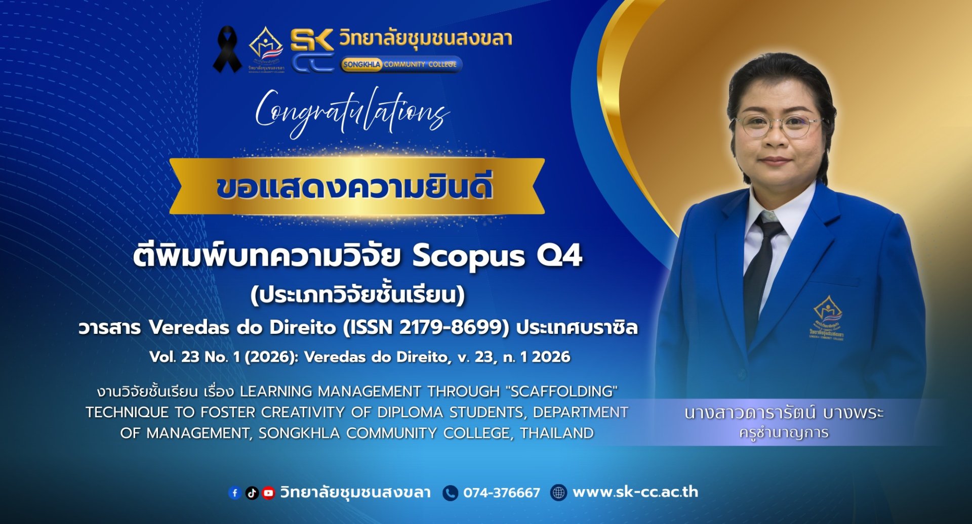 งานวิจัยชั้นเรียน เรื่อง LEARNING MANAGEMENT THROUGH "SCAFFOLDING" TECHNIQUE TO FOSTER CREATIVITY OF DIPLOMA STUDENTS, DEPARTMENT OF MANAGEMENT, SONGKHLA COMMUNITY COLLEGE, THAILAND