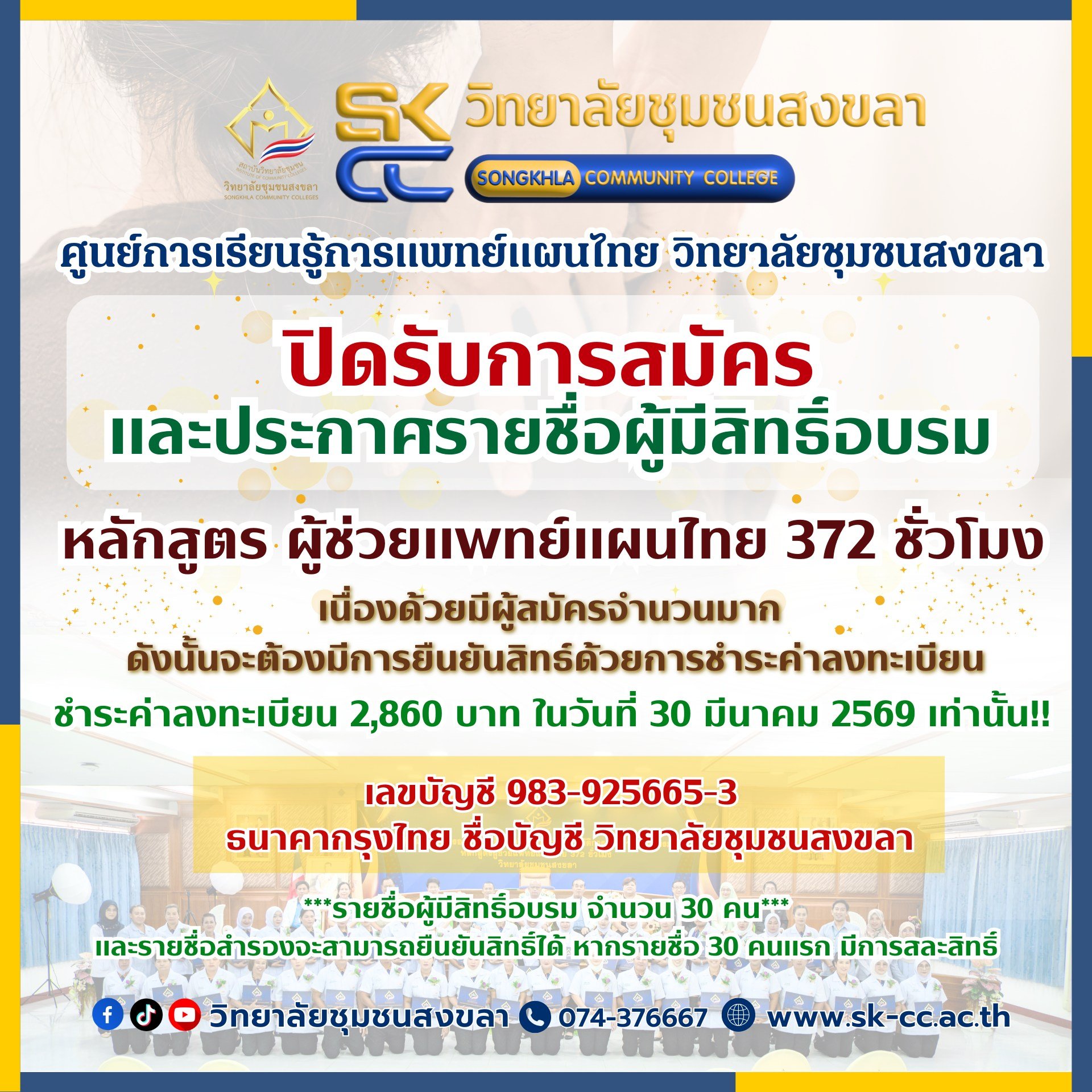 --> รายชื่อผู้มีสิทธิเข้ารับการอบรม หลักสูตร ผู้ช่วยแพทย์แผนไทย 372 ชั่วโมง" รุ่นที่ 2