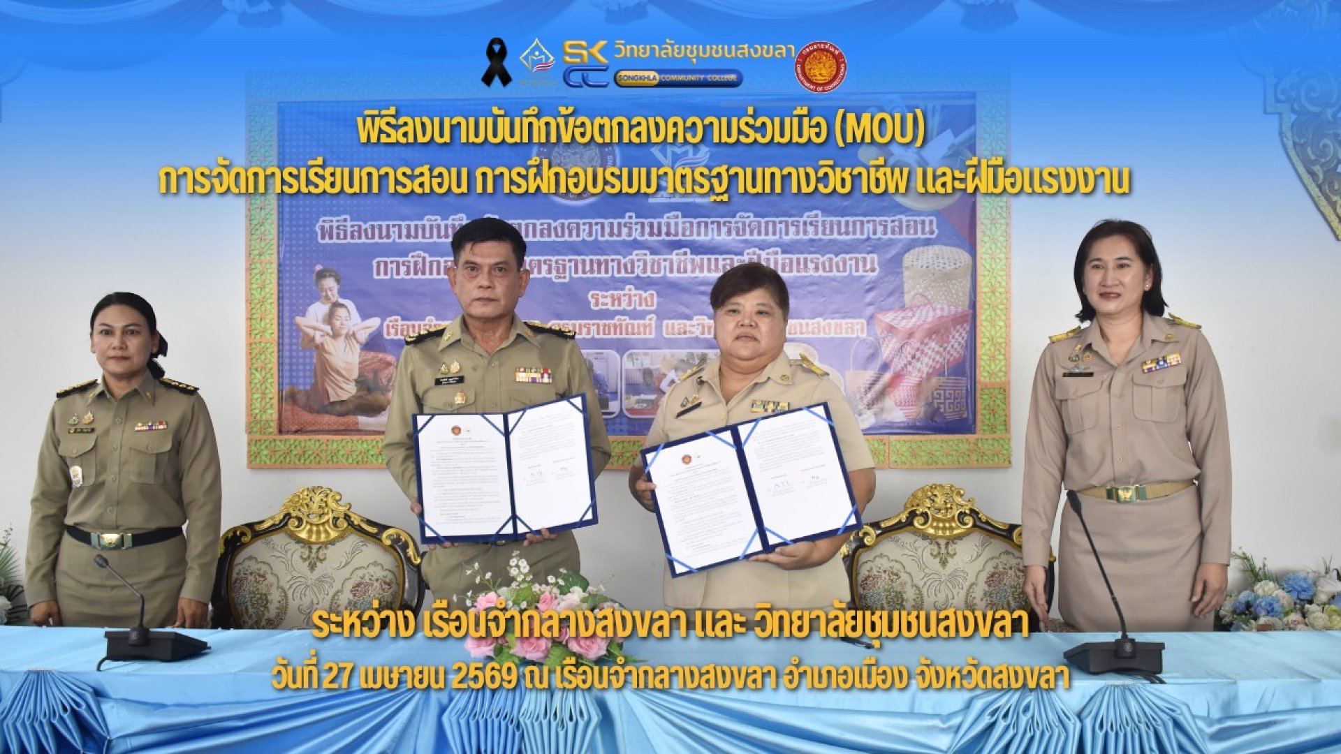 วิทยาลัยชุมชนสงขลา นำโดย นางสาวพรเพ็ญ ประกอบกิจ ผู้อำนวยการวิทยาลัยชุมชนสงขลา นางสาวศุภมาส อยู่อริยะ รองผู้อำนวยการฯ ร่วมเป็นประธานร่วม ใน "พิธีมอบใบประกาศผู้ผ่านการอบรม หลักสูตรนวดไทยเพื่อสุขภาพ 150 ชั่วโมง สำหรับผู้ต้องขังที่ผ่านการอบรม" ดำเนินการระหว่างวันที่ 1-24 เมษายน 2569 ในวันที่ 27 เมษายน 2569 ณ เรือนจำกลางสงขลา อำเภอเมือง จังหวัดสงขลา พร้อมให้โอวาท ขวัญกำลังใจ และสร้างแรงบันดาลใจให้แก่ผู้ต้องขัง