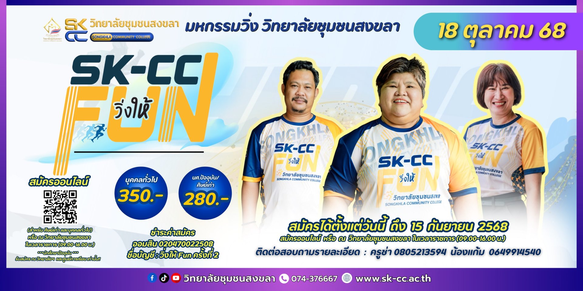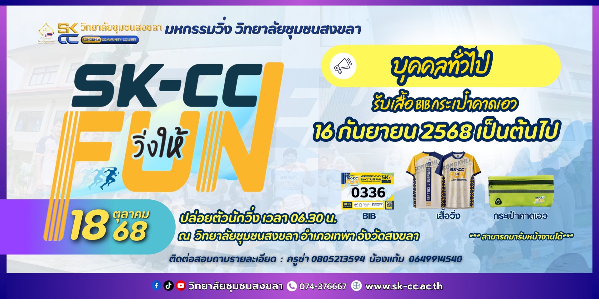SK-CC วิ่งให้ FUN 2568 18 ตุลาคม 2568 บุคคลทั่วไป รับเสื้อวิ่ง BIB กระเป๋าคาดเอว ตั้งแต่วันที่ 16 ตุลาคม 2568 เป็นต้นไป